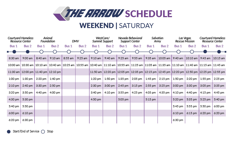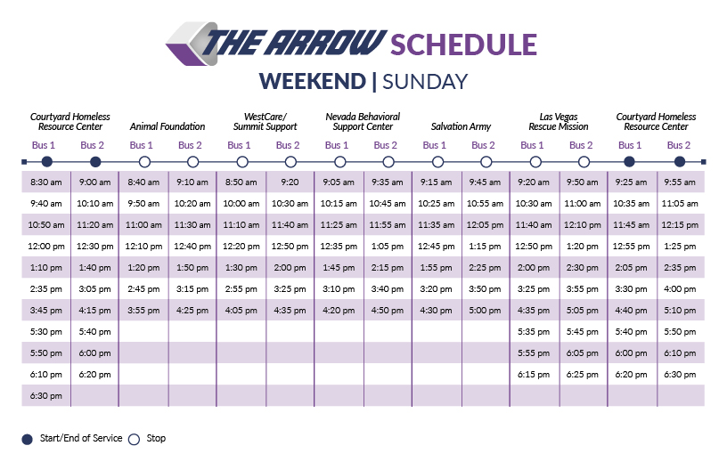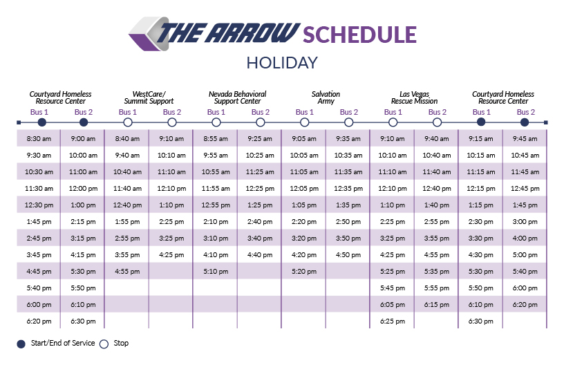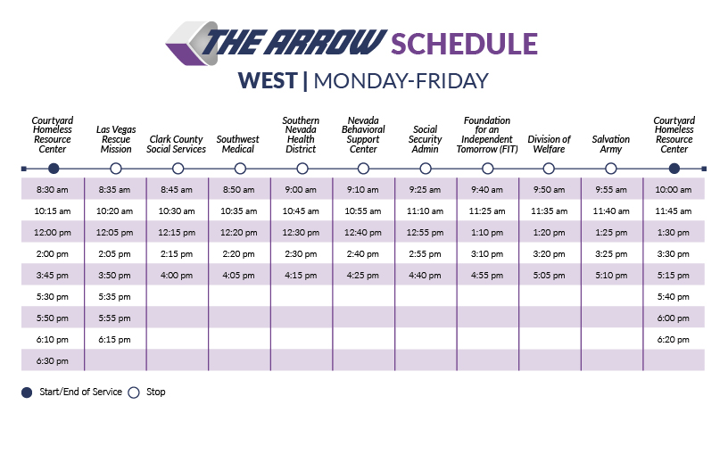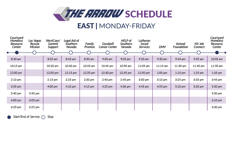 The Arrow shuttle provides regularly scheduled no-cost transportation in Las Vegas for those undergoing homelessness. It’s designed to aid people experiencing homelessness in travels to and from institutions that supply basic essential services such as benefits, social services, health care, meals, and shelter.